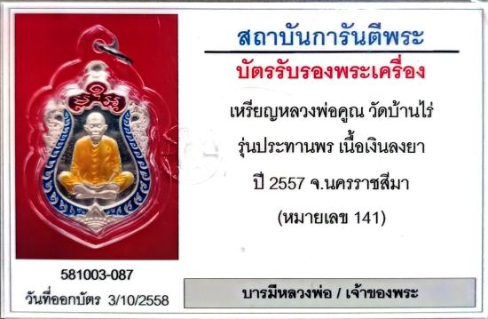 หลวงพ่อคูณ เสมาประทานพร 2557 เนื้อเงินลงงยา 3 สี สวยๆ แยกจากชุดกรรมการ หมายเลข ๑๔๑ เลี่ยมเก็บผิวพร้อมใช้ พร้อมบัตรรับรอง กล่องเดิม ตอนแรงๆหมื่นกว่าๆ