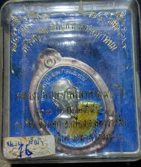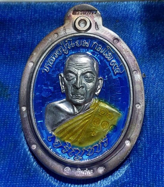 เหรียญเจริญพรเมตตามหานิยม หลวงปู่นิยม กมโล เนื้อเงินลงยาฟ้าไม่ตัดปีก หลังแบบ ๙รอบ กรรมการ no ๑๖ วัดแจ้งนอก ปี 2555 |