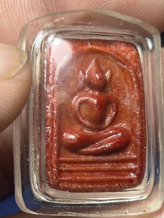 "พระสมเด็จมีกิน เนื้อผงน้ำมันเคลือบสีแดง อาจารย์ลอย โพธิ์เงิน พิมพ์เล็ก ๒๕๑๘" |
