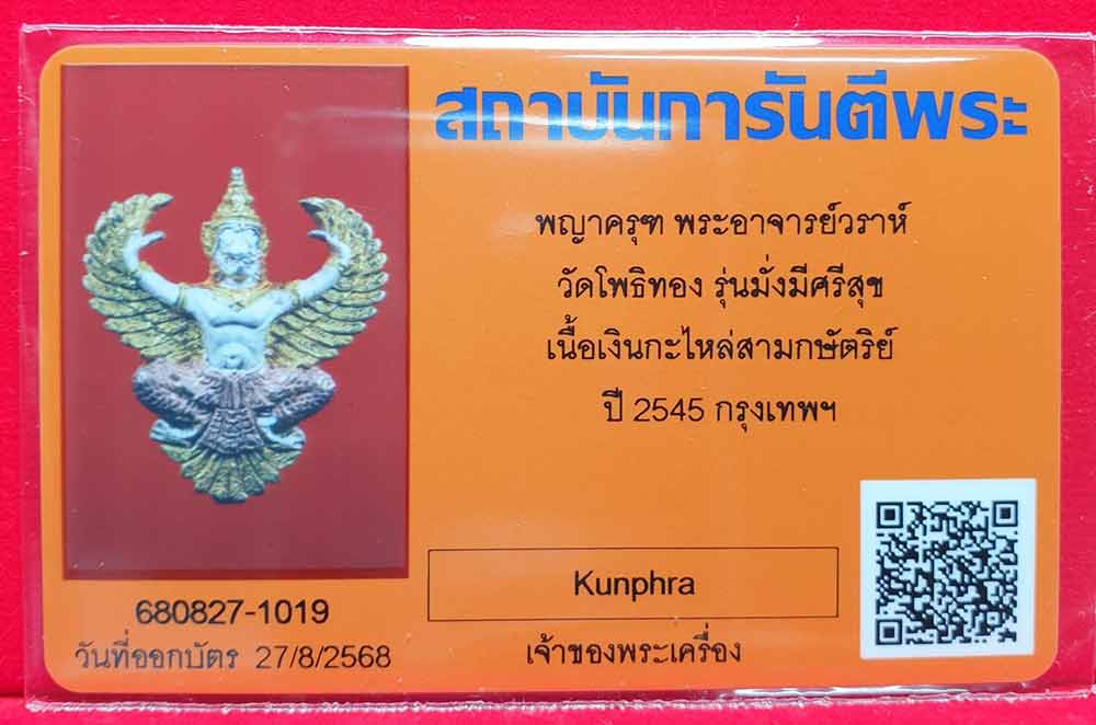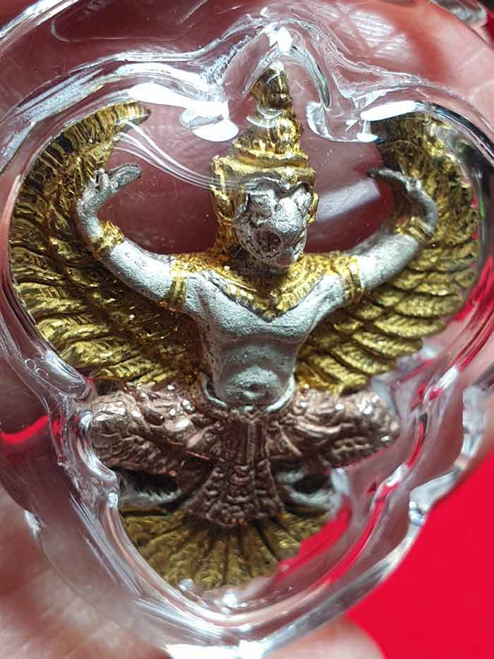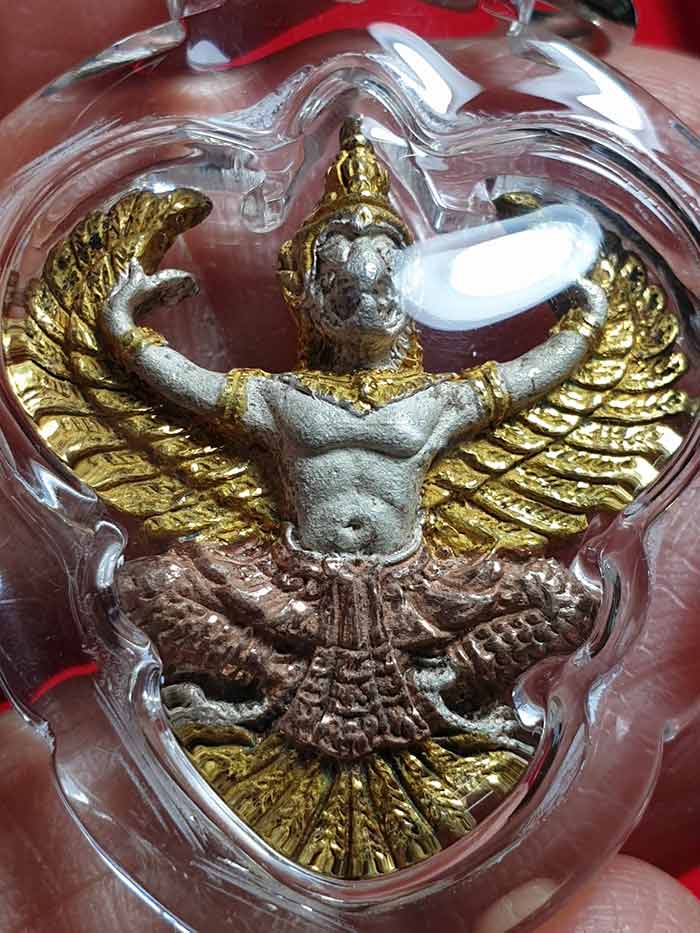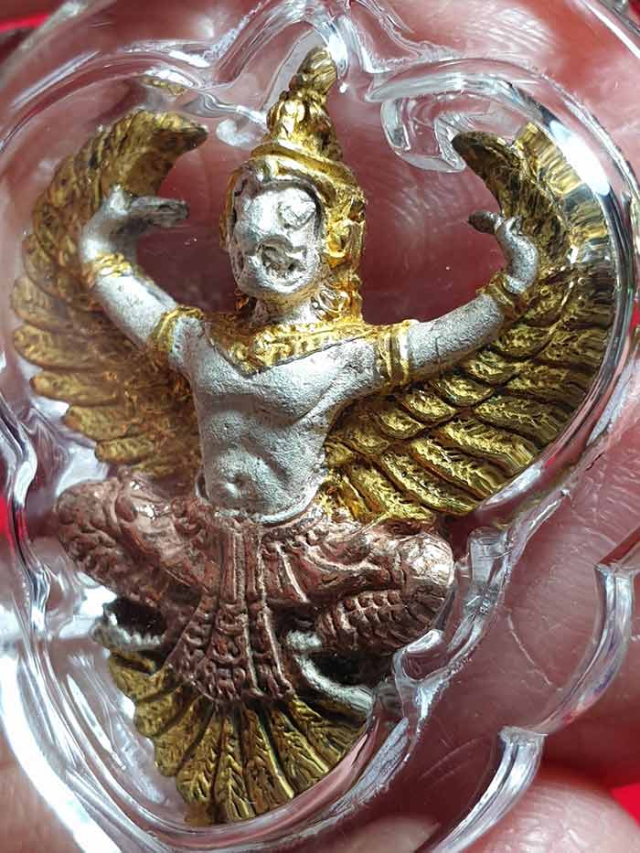 พญาครุฑ พระอาจารย์วราห์ วัดโพธิทอง รุ่นมั่งมีศรีสุข เนื้อเงิน กะไหล่สามกษัตริย์ ปี 2545 กรุงเทพฯ เคาะเดียวแดง 2,500 บาท เลี่ยมกันน้ำอย่างดีพร้อมบูชา