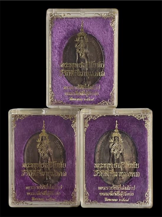 เหรียญพระพุทธสุริโยทัย ฯ หลัง สก. "พระราชพิธีสมโภช พระเจดีย์ศรีสุริโยทัย" ปี 2534 (พิธีใหญ่ ลพ.รวย,ลพ.คูณ,ลป.กาหลง,ลป.สิม ฯลฯ ปลุกเสก) เนื้อนวะโลหะ สวยมาก กล่องเดิมๆ จำนวน 3 องค์