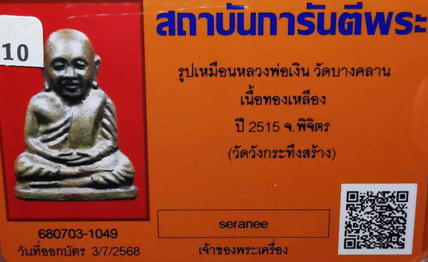 ชื่อพระเครื่อง รูปเหมือนหลวงพ่อเงิน วัดบางคลาน เนื้อทองเหลือง ปี2515 (วัดวังกระทึงสร้าง) + บัตรG-pra สภาพเดิมค่ะ