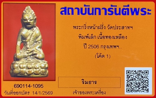 พระกริ่งหน้าฝรั่ง วัดประสาท ฯ พิมพ์เล็ก ปี2506 (โค๊ตเลข1) มีบัตรรับรองจีพระ เคาะเดียว(องค์ที่2)