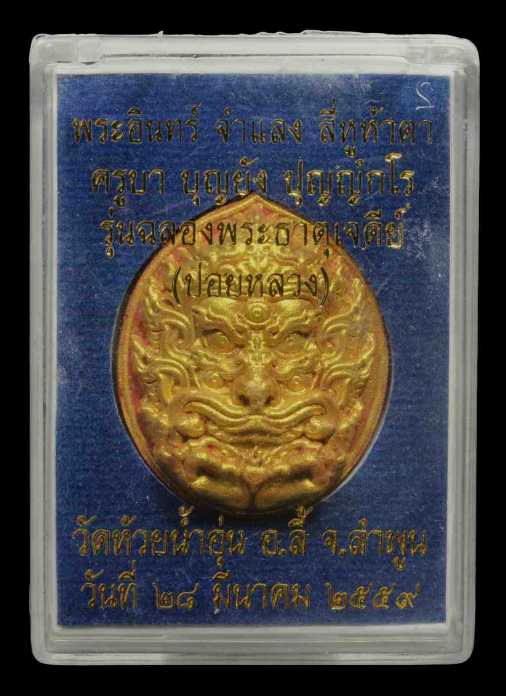สี่หูห้าตา (พระอินทร์จำแลง) ครูบาบุญยัง วัดห้วยน้ำอุ่น จ.ลำพูน รุ่นฉลองพระธาตุเจดีย์ ปี 2559 เนื้อผง หน้ากากปัดทอง ตอกโค๊ต และหมายเลขกำกับ พร้อมกล่องเดิมๆ