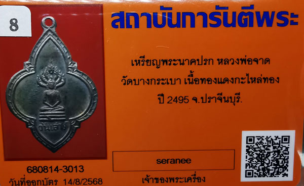 (วันเสาร์)เหรียญพระปางนาคปรก หลวงพ่อจาด วัดบางกระเบา เนื้อทองแดงกะไหล่ทอง ปี2495 จ.ปราจีนบุรี + บัตรG-pra สภาพเดิมค่ะ |