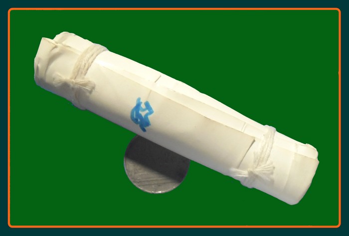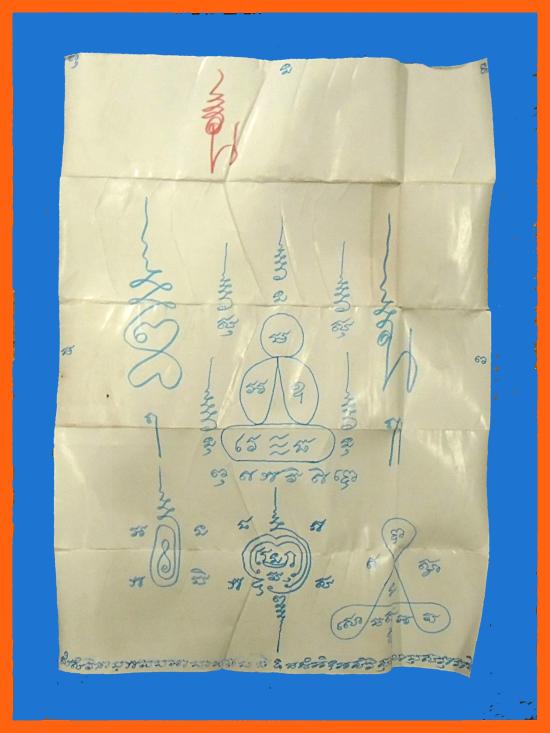 ตะกรุดพับจากใบอนุโมทนาบัตร มีจารปากกาเมจิคด้านหลัง