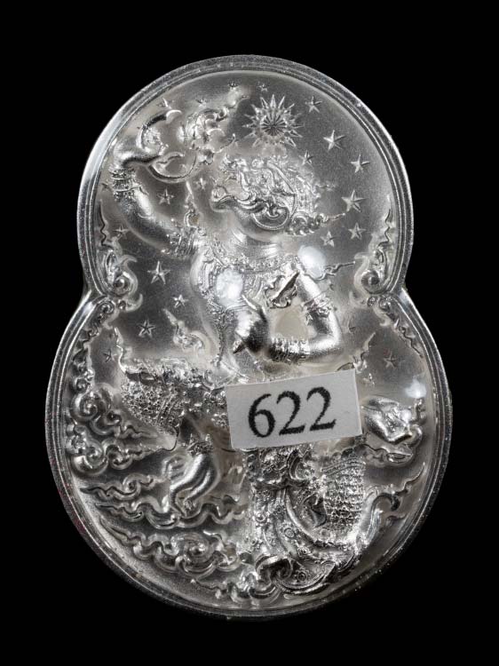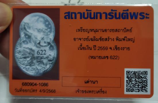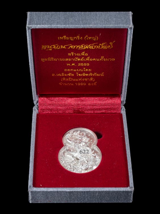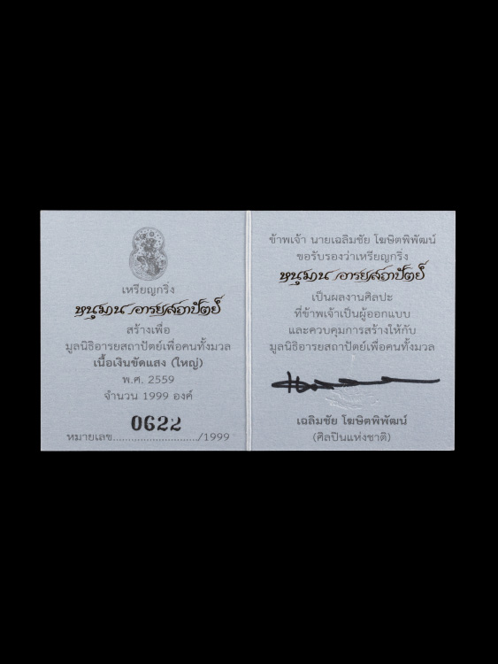 เหรียญกริ่งหนุมานอารยสถาปัตย์ เนื้อเงินขัดแสง พิมพ์ใหญ่ หมายเลข 622 บัตรรับรอง อุปกรณ์ครบ