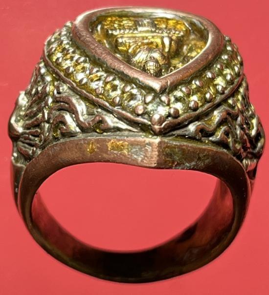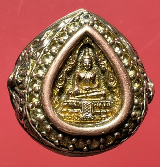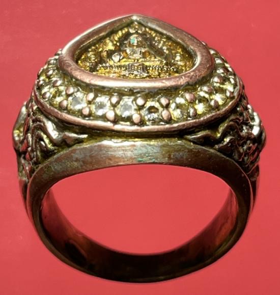 แหวนเนื้อ 3 กษัตริย์ งานช่างแกะสั่งทำ หัวแหวนติดเหรียญหล่อรูปหยดน้ำ หลวงพ่อวัดไร่ขิง นครปฐม ปี2543 เนื้อ 3 กษัตริย์ฝังพลอยรอบวง ขนาดนิ้วผู้ชาย