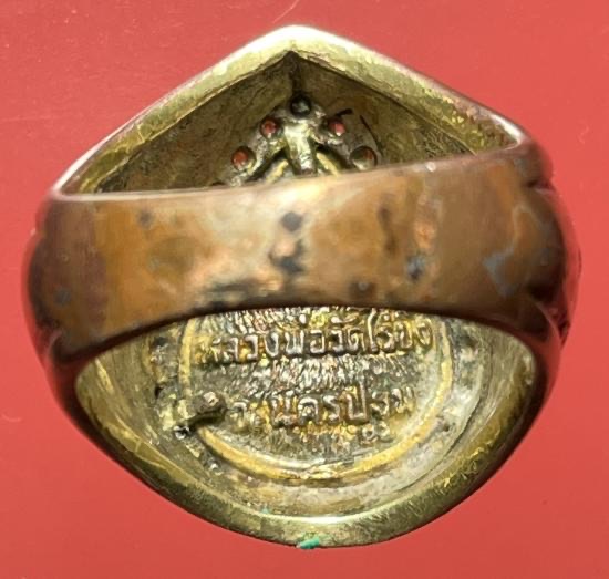 แหวนเนื้อ 3 กษัตริย์ งานช่างแกะสั่งทำ หัวแหวนติดเหรียญหล่อรูปหยดน้ำ หลวงพ่อวัดไร่ขิง นครปฐม ปี2543 เนื้อ 3 กษัตริย์ฝังพลอยรอบวง ขนาดนิ้วผู้ชาย |