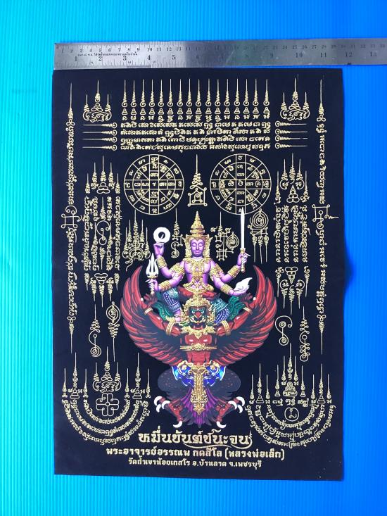 ผ้ายันต์ พระนารายณ์ทรงสุบรรณ หมื่นยันต์ชนะจน พระอาจารย์อรรณพ(อาจารย์เล็ก) วัดถ้ำเขาน้อย จ.เพชรบุรี ผ้ากำมะหยี่สีดำ ขนาด A3 (11.5 นิ้วx 16.6 นิ้ว) |