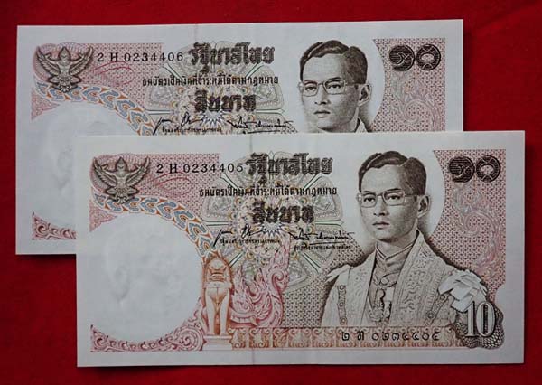 **** ทุกวันพุธ !!! ธงฟ้า 50 บาท !!! **** หมายเลขเรียง 2 ฉบับ !!!!! ธนบัตรในหลวง ร.๙ (โทมัส แบบ11) ราคา 10 บาท (หลังวัดเบญจฯ) สภาพสวย ไม่ผ่านการใช้ (มีรอยพับกลางเบาๆ) |
