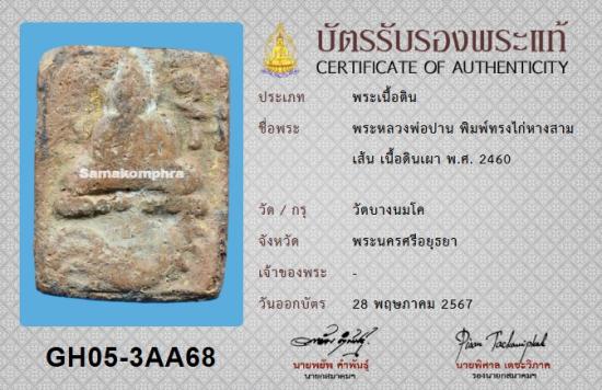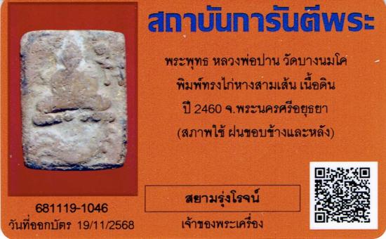 ชื่อพระเครื่อง พระหลวงพ่อปาน วัดบางนมโค พิมพ์ทรงไก่หางสามเส้น +บัตรรับรอง2สถาบัน