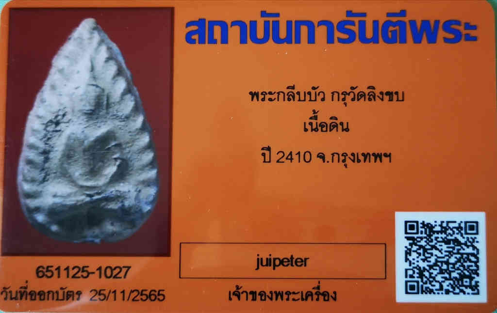 ชื่อพระเครื่อง พระกลีบบัว กรุวัดลิงขบ เนื้อดิน ปี 2410 พร้อมบัตรรับรองการันตรีพระ