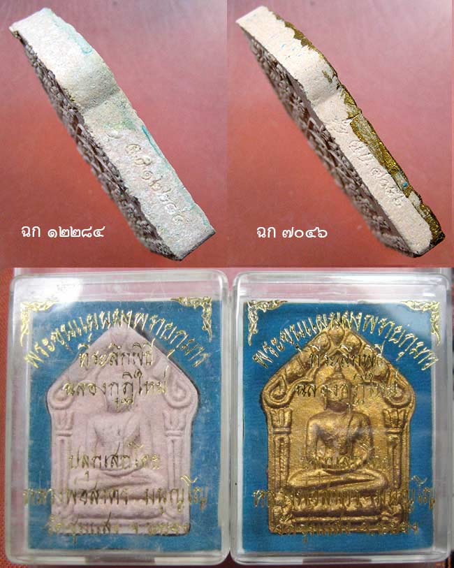 พระขุนแผนผงพรายกุมาร ที่ระลึกพิธีฉลองกุฎิ เนื้อชมพู ปี ๒๕๕๓ ไม่ทาทอง หมายเลข ๑๒๒๘๔ และทาทอง หมายเลข ๗๐๔๖ พร้อมกล่องเดิมๆ