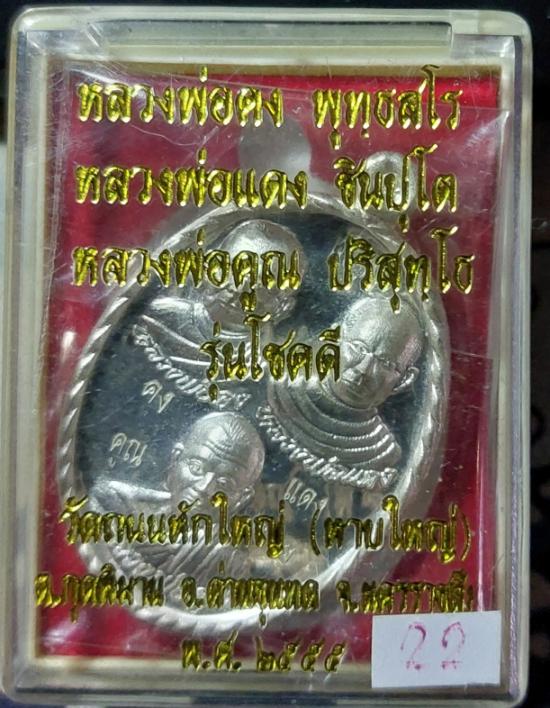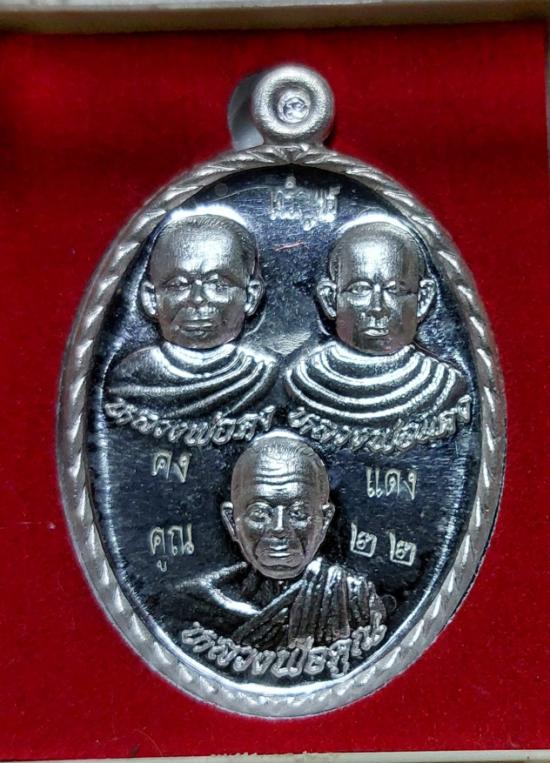 เหรียญสามคณาจารย์ หลวงพ่อคง หลวงพ่อแดง หลวงพ่อคูณ รุ่นโชคดี เนื้อเงิน เลข๒๒ วัดถนนหักใหญ่ ปี ๒๕๕๕