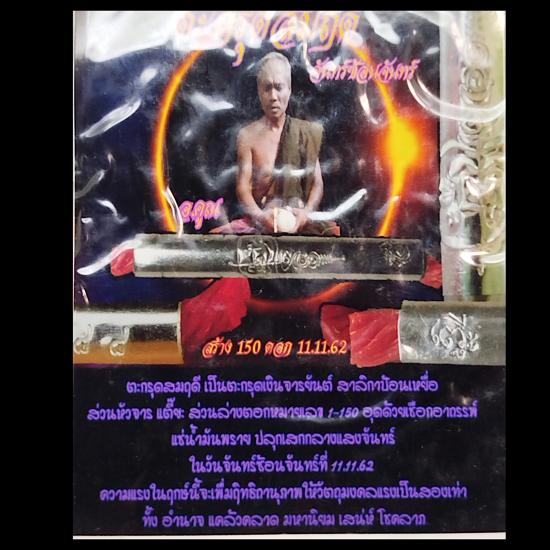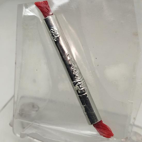 ตะกรุดสมฤดี เนื้อเงิน จารยันต์สาริกาป้อนเหยื่อ สร้างจำนวน 150 ดอก สอดตะกรุดด้วยเชือกอาถรรพ์ แช่น้ำมันพรายดอกทอง ปลุกเสกในคืนจันทร์ซ้อนจันทร์