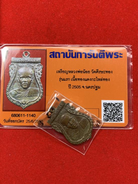 พระหลวงพ่อ น้อย วัดศีรษะทอง รุ่นแรกปี 2505 เนื้อทองแดงกะไหล่ทองเดิม จาร์หน้า 4 หลัง 4 ครับ มาพร้อมบัตรรับรองครับ