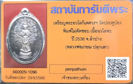 เหรียญเจ้าแม่กวนอิมปางพันมือ วัดประตูป่อง จังหวัดลำปาง.พ.ศ. 2536 เนื้อนวโลหะไม่ตัดปีกสร้างสร้างจำนวน 990 เหรียญ. ปลุกเสกโดยหลวงพ่อเกษม เขมโก สำหรับประวัติทางธรรม หลวงพ่อเกษม เขมโก นั้นท่านทรงปฏิบัติธรรมจนบรรลุถึงขั้นอุกฤษฏ์ โดยเฉพาะการแยกกายและจิตออกจากกันในระดับญาณ 4 (จตุตถญาณ) ทำให้ท่านมีจิตที่สงัด มั่นคง สามารถทนต่อความเจ็บปวดทางกาย ความร้อนหนาวได้ โดยไม่แสดงอาการ เหมือนกายและจิตแยกขาดจากกัน ถือเป็นระดับที่สูงส่งมากในทางจิตวิญญาณ.สำหรับธรรมขั้นอุกฤษฏ์ (อุกฤษฏ์) คือ ธรรมะระดับสูงสุด หรือธรรมะที่ลึกซึ้งกว่าขั้นพื้นฐาน มักหมายถึงหลักธรรมที่นำไปสู่การรู้แจ้งนิพพาน เช่น วิปัสสนาญาณ (ญาณเห็นความเกิดดับของสังขาร) ที่เป็นลำดับญาณในสายการปฏิบัติวิปัสสนา ตั้งแต่ต้นจนถึงโคตรภูญาณ (ก้าวข้ามความเป็นปุถุชน) และมัคคญาณ-ผลญาณ (การหยั่งรู้ในอริยมรรค-ผล) ซึ่งเป็นหัวใจของการบรรลุธรรมขั้นสูงในพระพุทธศาสนา เพื่อให้เกิดความเข้าใจจริงในไตรลักษณ์และนิพพาน. และวัตถุมงคลที่ปลุกเสกโดยพระเกจิผู้มีญาณหยั่งรู้ขั้นอุกฤษฏ์ จะมีพุทธคุณครอบคลุมสูงมาก ทั้งคงกระพันชาตรี แคล้วลาด ป้องกันภัย และเมตตามหานิยม เช่น เสริมดวงชะตา (หุ่นพยนต์), สะท้อนกลับสิ่งชั่วร้าย (มนต์พระกาฬ) โดยเน้นที่การปฏิบัติจริงจนเกิดอภิญญา ทำให้วัตถุมงคลมีฤทธิ์เข้มขลัง ไม่ใช่แค่คาถา แต่รวมถึงพลังจิตที่ส่งผ่านไปยังวัตถุนั้นๆ โดยเฉพาะรุ่นที่ท่านตั้งใจเสกและมีประสบการณ์จริงจากผู้บูชา. หลวงพ่อเกษมเป็นพระสายวิปัสสนากรรมฐาน ไม่ยึดติดในวัตถุ แต่ท่านก็สร้างวัตถุมงคลเพื่อสงเคราะห์ญาติโยม และเน้นให้ผู้บูชาตั้งมั่นในคุณพระศรีรัตนตรัยและหมั่นทำบุญอธิษฐาน "กรรมอันเป็นกุศลนี้ อันข้าพเจ้าได้กระทำแล้ว" (อิทัง กุศลกัมมัง มยา กะตัง) เพื่อเสริมส่งบารมีตนเองด้วย.