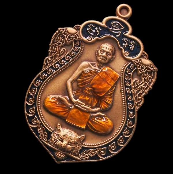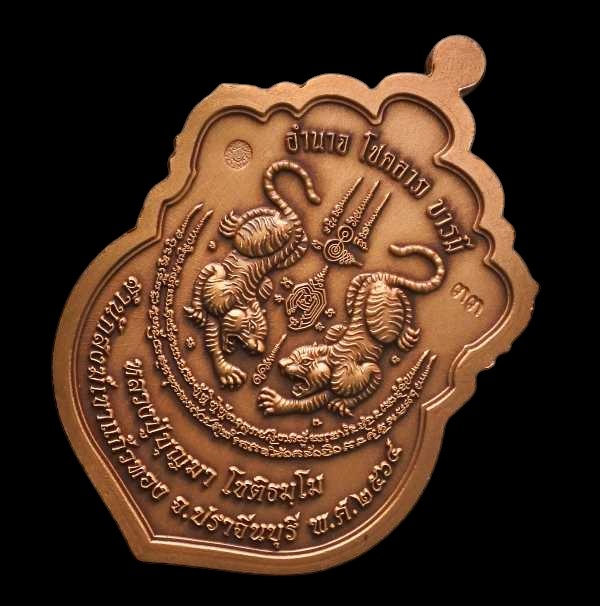 เหรียญเสมาเสือคาบดาบ 1 พยัคฆ์บุญมา มหาบารมี หลวงปู่บุญมา สำนักสงฆ์เขาแก้วทอง เนื้อทองแดงซาติน ลงยาขอบน้ำเงิน บนน้ำเงิน+จีวร (หลังเสือคู่) หมายเลข 33