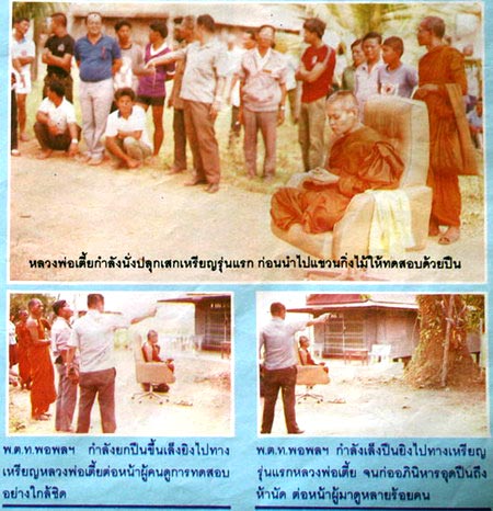 ได้วิชาจากหลวงพ่อกวยไปหลายอย่าง ที่เด่นๆคือวิชาขอดผ้า ท่านเคยขอดผ้าให้ศิษย์ลองยิง ไม่ออก เคยลงผ้ายันต์ค่ายกลเเบบหลวงพ่อเฒ่า ให้คนยิง ลูกปืนไหลออกจากกระบอกเลย เมื่อราวๆปี๒๕๓๔ ถ้าใครเคยอ่านหนังสือลานโพธิ์ จะมีภาพลงหน้ากลาง ท่านเสกเหรียญให้คนลองยิง เสกเสร็จ เอาไปเเขวนต้นไม้ ย่อยิง สามนัด ไม่ออก |
