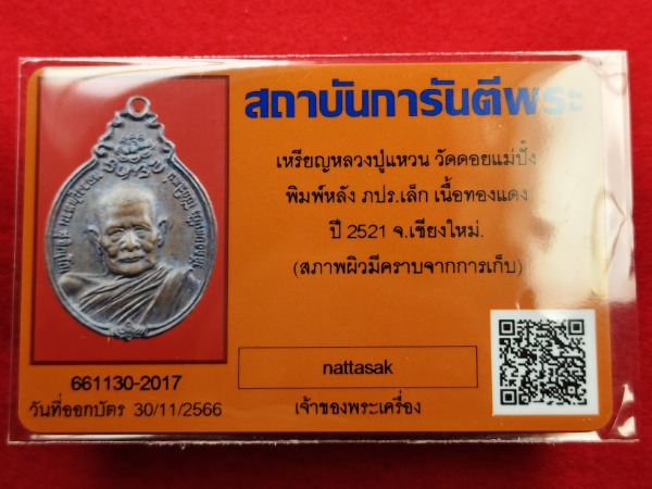 เหรียญ สร้างตึกโรงพยาบาล หลัง ภปร.เล็กจหลวงปู่แหวน ปี 2521 เนื้อทองแดงพร้อมบัตรรับรองระบุมีคราบจากการเก็บ |