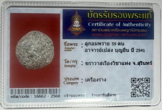 ลูกอมผงพราย 59 ตน อาจารย์เปล่ง บุญยืน ปี 2541 จ.สุรินทร์ พร้อมบัตรรับรอง |