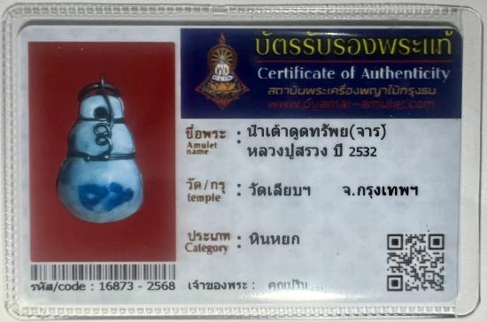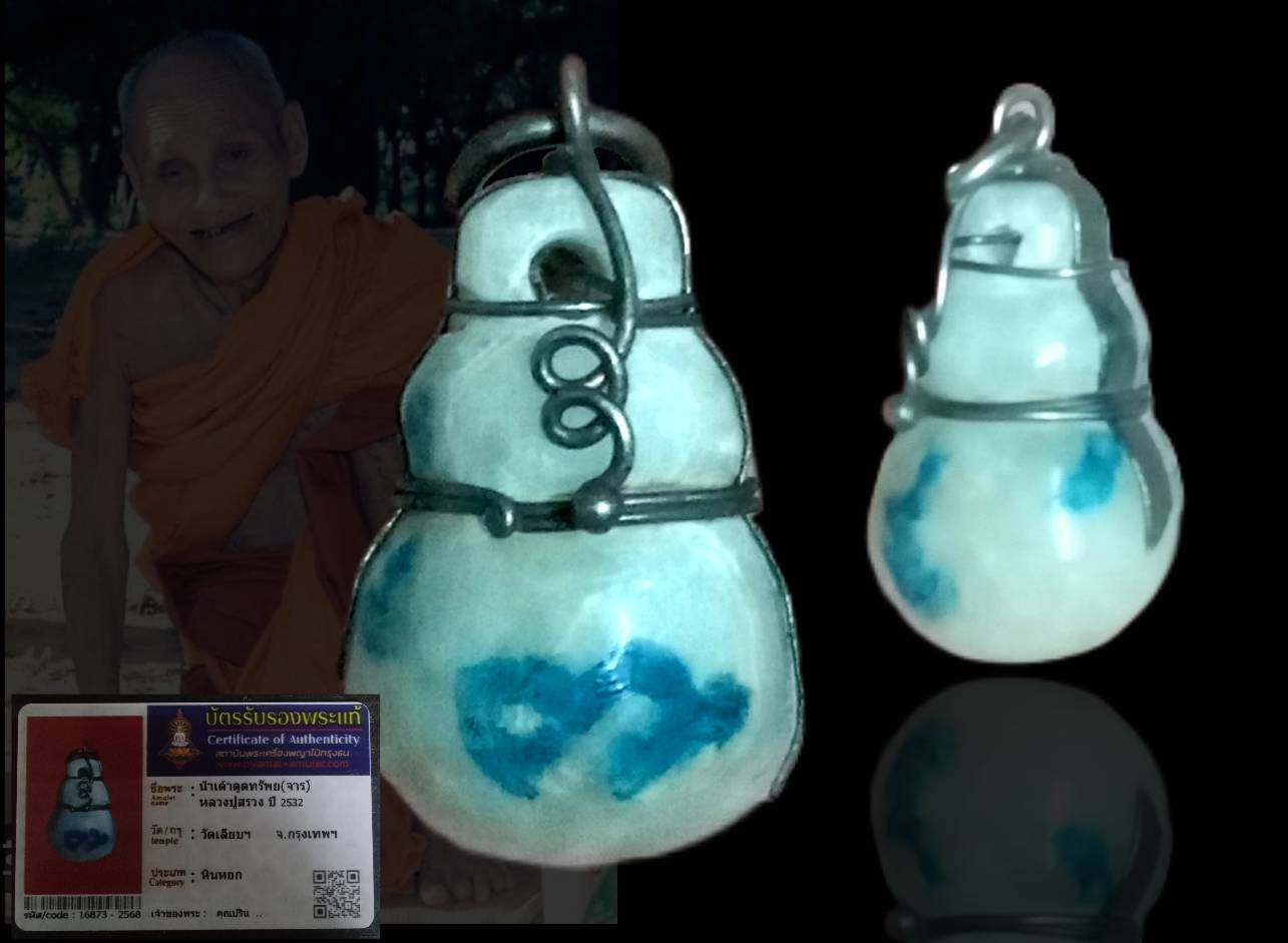 น้ำเต้าหยกดูดทรัพย์ เนื้อหยกแท้ " หลวงปู่สรวง เทวดาเล่นดิน จ.ศรีสะเกษ สร้างจากหยกแท้ โดยหลวงพ่อสร้อย วัดเลียบราษฏร์บำรุง กรุงเทพฯ จัดสร้างเมื่อปี 2532 จารเต็มแรไอเทม พร้อมบัตรรับรอง |