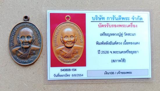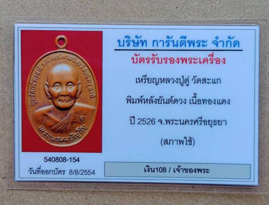 เหรียญหลวงปู่ดู่ วัดสะแก พิมพ์หลังยันต์ดวง เนื้อทองแดง จ พระนครศรีอยุธยาอยุธยา ปี2526 พร้อมบัตรรับรอง (สภาพใช้) ตามรูป