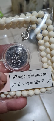 เหรียญอายุวัฒนมงคล 80 ปี เนื้อตะกั่ว(มีค่าดั่งทองคำ)หลวงตาม้า วัดถ้ำเมืองนะ พร้อมรอยจารหลวงตาม้า เลี่ยมจากวัดพร้อมประคำ