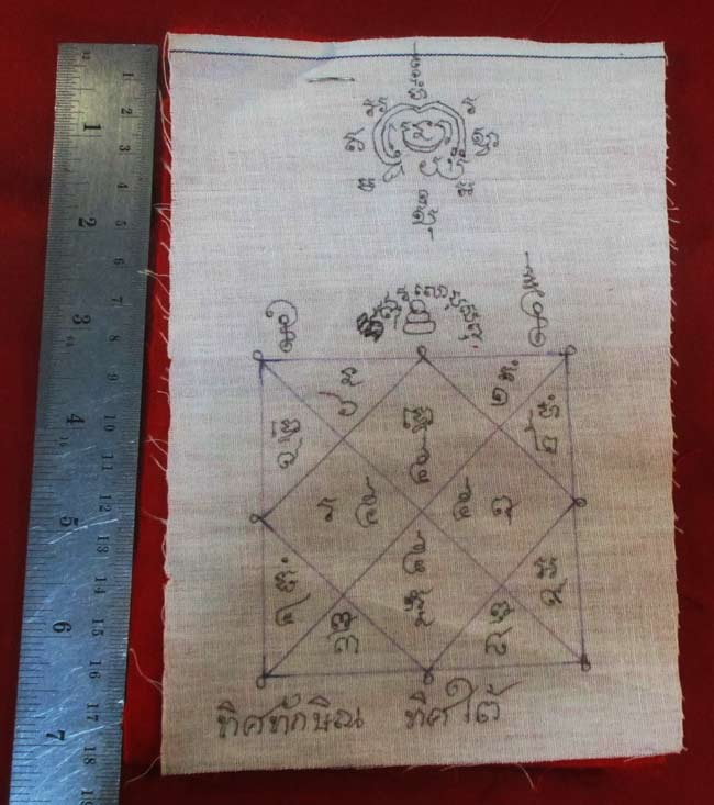 ผ้ายันต์ ไม่ทราบที่ จารยันต์ด้วยมือ ที่ผ้ายันต์เขียน "ทิศทักษิณ ทิศใต้" ครับ (พระบ้าน ครับ) |