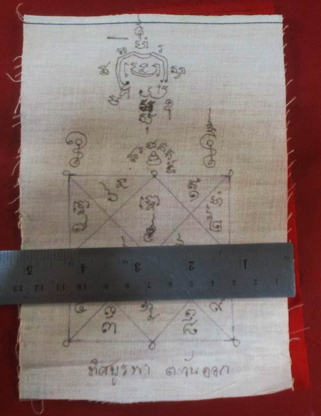 ผ้ายันต์ ไม่ทราบที่ จารยันต์ด้วยมือ ที่ผ้ายันต์เขียน "ทิศบูรพา ตะวันออก" ครับ (พระบ้าน ครับ) |