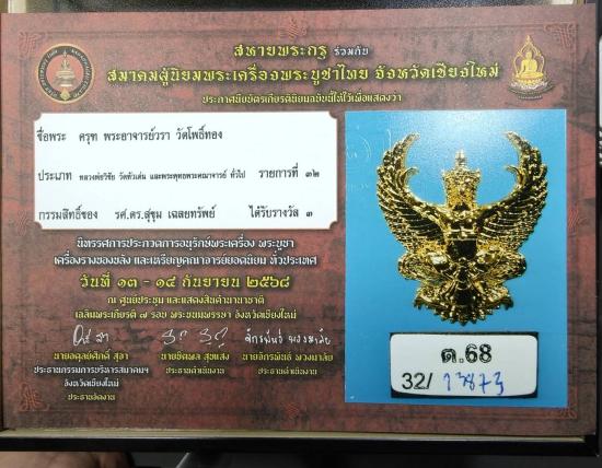 ได้รับรางวัลที่3 นิทรรศการประกวดการอนุรักษ์พระเครื่อง พระบูชา เครื่องรางของขลัง และเหรียญคณาจารย์ยอดนิยม ทั่วประเทศ |