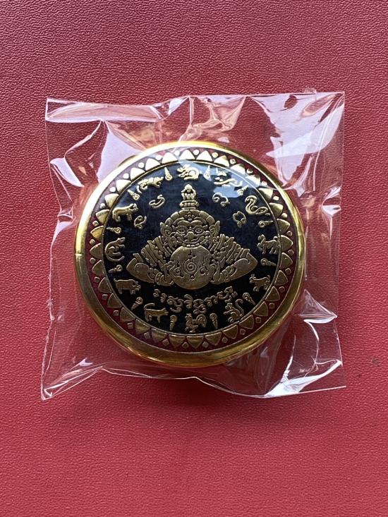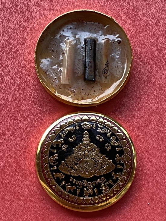 เคาะเดียวแดง สีผึ้งพระราหู รุ่น มงคลจักรวาล เนื้อ โลหะชุบทองลงยาสีดำขอบสีแดง ขนาด5ซม |