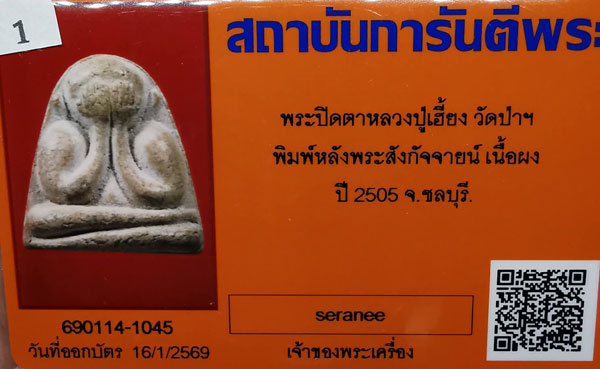 พระปิดตาหลวงปู่เฮี้ยง วัดป่าฯ พิมพ์หลังพระสังกัจจายน์ เนื้อผง ปี2505 จ.ชลบุรี + บัตรG-pra สภาพเดิมค่ะ |