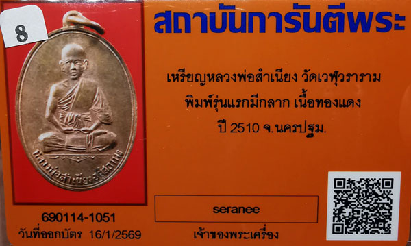 เหรียญหลวงพ่อสำเนียง วัดเวฬุวนาราม พิมพ์รุ่นแรกมีกลาก เนื้อทองแดงผิวไฟ ห่วงเดิม ปี2510 จ.นครปฐม + บัตรG-pra สภาพสวยเดิมค่ะ พระสภาพตามรูปทุกประการค่ะ