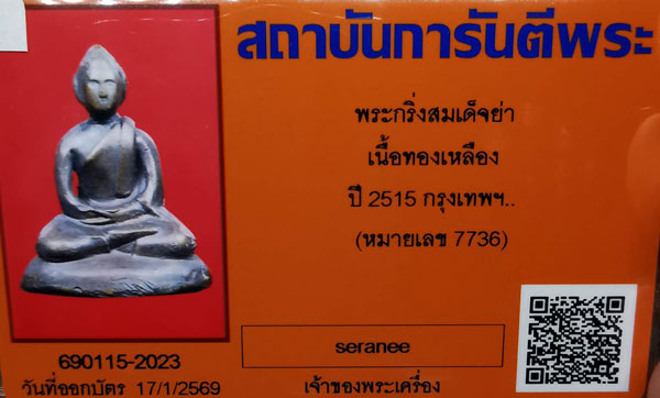 พระกริ่งสมเด็จย่า เนื้อทองเหลือง กริ่งดัง ปี2515 จ.กรุงเทพฯ (หมายเลข7736) + บัตรG-pra สภาพเดิมค่ะ |