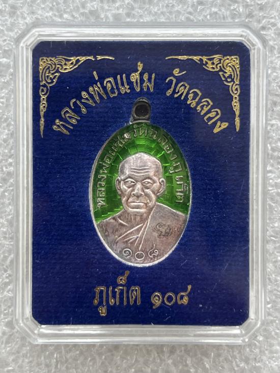 เหรียญเงินเนื้อเงินลงยาเขียว หลวงพ่อแช่ม วัดฉลอง ภูเก็ต รุ่น108ปี สวยเดิมนอนกล่อง