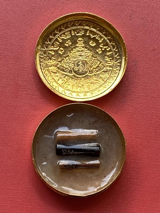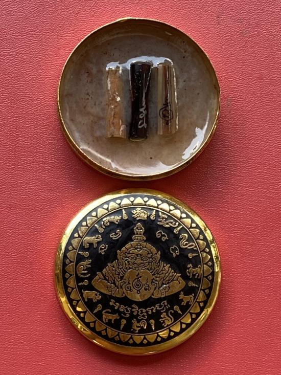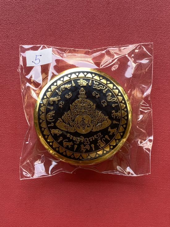 เคาะเดียวแดง สีผึ้งพระราหู รุ่น มงคลจักรวาล เนื้อ โลหะชุบทองลงยาสีดำขอบสีดำ ขนาด5ซม |