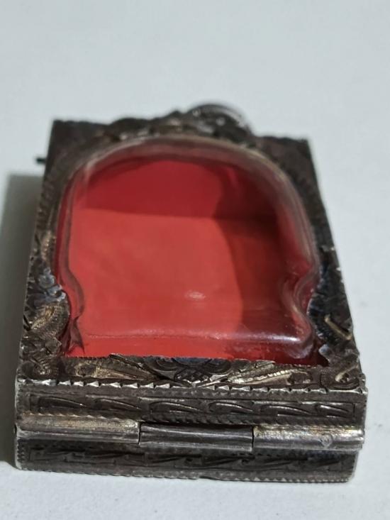 ตลับเงินแท้เก่า ปิดหลังแกะลายกนกเก่า.งานแกะมือ หัวสิงห์ใหญ่ ใส่พระสมเด็จหลวงปู่ภู วัดระฆัง.หนาหนัก 23.01 กรัม สมบูรณ์สนามใบละ 2,500 ราคาขายหลอมกรัมละ 88 เงินแพงมากต่อไปจะไม่มีขายแล้ว