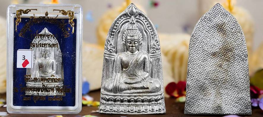 พระพุทธชินราชใบเสมา รุ่นประทานพร เนื้อชินเงิน หรือเนื้อปรอทขาว จัดสร้างขึ้นในปี 2547 มาพร้อมกล่องเดิมจากวัดครับ