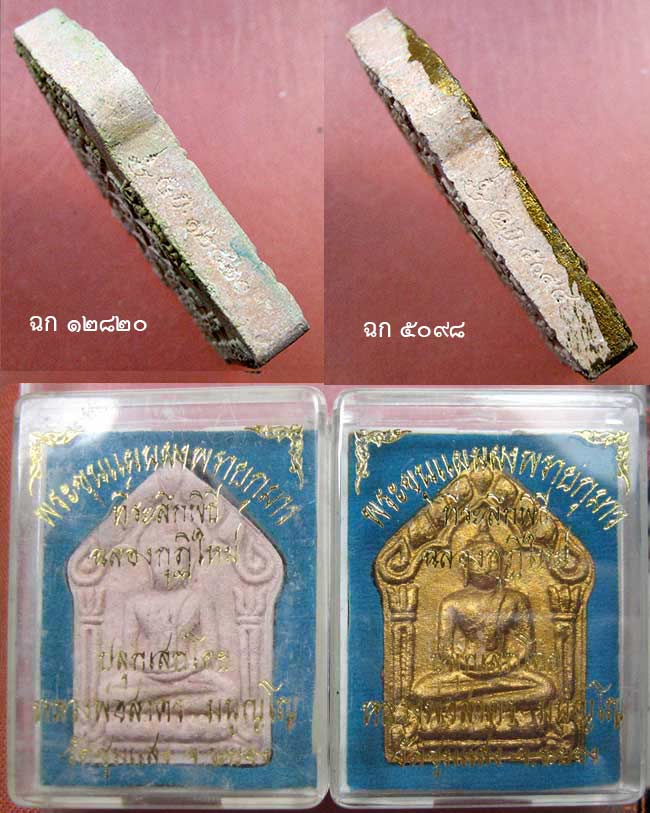 พระขุนแผนผงพรายกุมาร ที่ระลึกพิธีฉลองกุฎิ เนื้อชมพู ปี ๒๕๕๓ ไม่ทาทอง หมายเลข ๑๒๘๒๐ และทาทอง หมายเลข ๕๐๙๘ พร้อมกล่องเดิมๆ