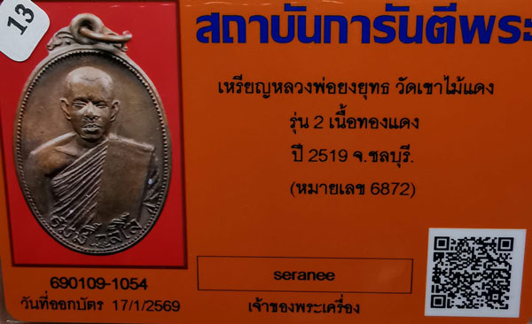 เหรียญหลวงพ่อยงยุทธ วัดเขาไม้แดง รุ่น2 เนื้อทองแดง ห่วงเดิม ปี2519 จ.ชลบุรี(หมายเลข6872) + บัตรG-pra สภาพเดิมค่ะ สภาพตามรูปทุกประการค่ะ