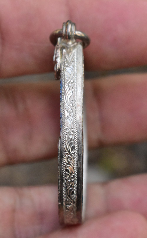 สมัยก่อนแบบนี้ทำใหม่ต้องมี 1500 ตอนนี้เงินราคาสูงมาก น่าจะแพงกว่านั้น งานดีแกะลึก ยกซุ้มบนล่าง น้ำหนัก 6 กรัม กว้าง 2.8x3.6 เซนติเมตร สวยแข็งแรง สมบูรณ์ดี ท่านใดชอบเรียนเชิญครับ