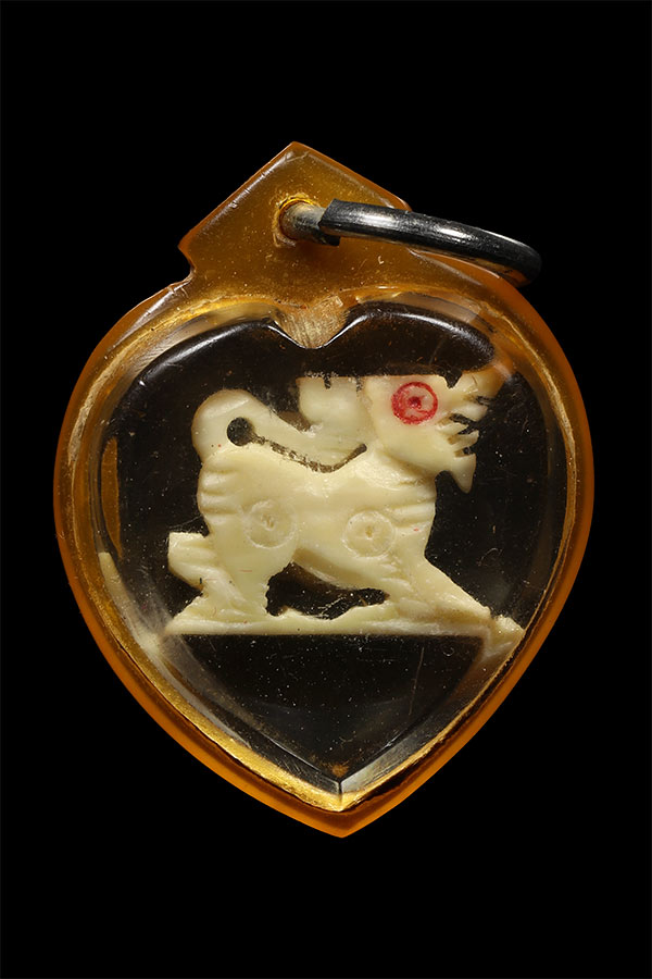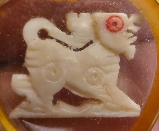 งาแกะ สิงห์ ไม่ทราบสำนัก ขนาดงากว้าง 1.3 ซ.ม. สูง 1 ซ.ม. พร้อมเลี่ยมพลาสติกเก่า