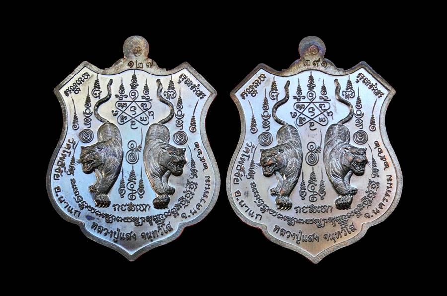 +!!เคาะเดียวllดง ตลอดสาย!!+ (รับ 2 เหรียญ) เหรียญ พยัคฆ์ 5 แผ่นดิน หลวงปู่แสง วัดโพธิ์ชัย จ.นครพนม ปี62 เนื้อทองแดงรมดำ หน้ากากปลอกลูกปืน เลขโค้ดสวยๆตามรูป พร้อมกล่องครับ