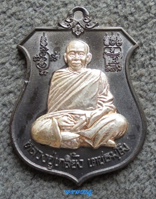เหรียญโล่กันภัย รุ่น เศรษฐีศรีสะเกษ หลวงปู่เกลี้ยง วัดโนนแกด จ.ศรีสะเกษ หลังนารายณ์ทรงครุฑเนื้อนวะหน้ากากเงิน หมายเลข ๑๒๒ สร้าง ๙๙๙ เหรียญ ปี ๒๕๕๗