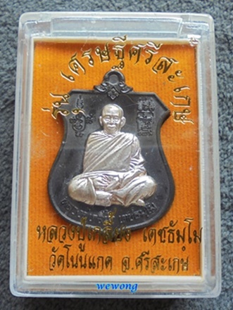 เหรียญโล่กันภัย รุ่น เศรษฐีศรีสะเกษ หลวงปู่เกลี้ยง วัดโนนแกด จ.ศรีสะเกษ หลังนารายณ์ทรงครุฑ เนื้อนวะหน้ากากเงิน หมายเลข ๑๒๒ สร้าง ปี ๒๕๕๗