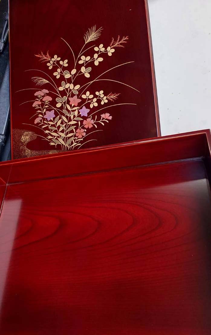 ***วัดใจ***กล่องไม้เแลคเกอร์ญี่ปุ่นสีแดงเข้มวินเทจตกแต่งลายทอง หญ้าและดอกไม้ในฤดูใบไม้ร่วง ขนาด 12 X 9 นิ้ว สูง 2.5 นิ้ว |
