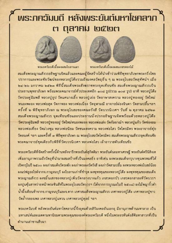 พระปิดตายันต์ดวงเล็ก หรือยันต์ดวงสุกิตติมา เนื้อผงเกสรผสมว่าน ๑๐๘ ชนิด สอดตะกรุดเงิน หลังพระเกศา สมเด็จพระญาณสังวร(เจริญ สุวัฑฒโน ปธ.๙) เกศาหลวงปู่โต๊ะ วัดประดู่ฉิมพลี เกศาหลวงปู่ดุลย์ วัดบูรพาราม เกศาหลวงปู่ขาว วัดถ้ำกลองเพล เกศาหลวงปู่แหวน วัดดอยแม่ปั๋ง ฯลฯ (ตามใบฝอยประวัติการสร้าง)พิธีพุทธาภิเษก ณ พระอุโบสถคณะรังสี วัดบวรนิเวศวิหาร ๒ ตุลาคม ๒๕๒๓ หลวงปู่โต๊ะ วัดประดู่ฉิมพลี ร่วมปลุกเสก สมเด็จพระญาณสังวรฯทรงจุดเทียนชัยและประธานอธิษฐานจิต พร้อมด้วยพระคณาจารย์แห่งยุคอีกหลายรูป ไม่มีกล่อง เคาะเดียว มาพร้อมบัตรรับรองชมรมพระเครื่องท่าพระจันทร์