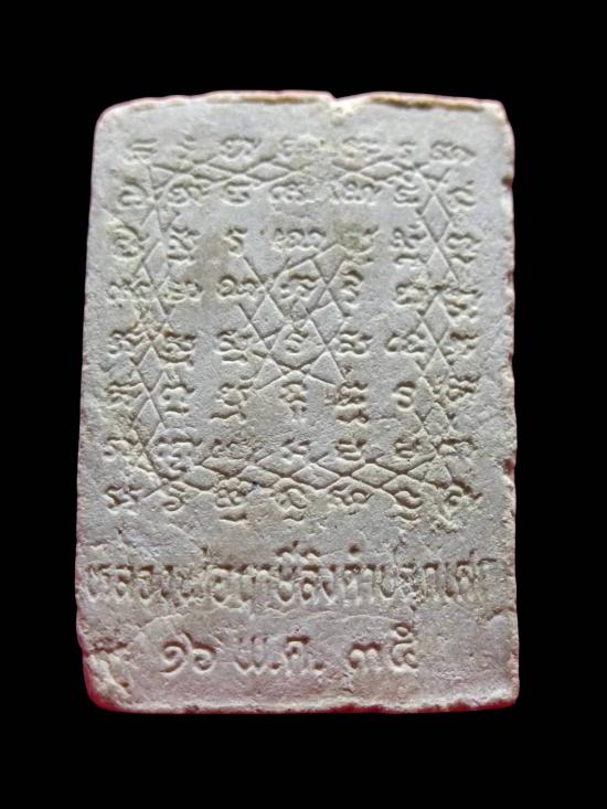 ด้านหลังเป็นยันต์เกราะเพชร และเขียนวันที่ 16 พ.ค. 35 ซึ่งเป็นพิธีเดียวกันกับวันพุทธาภิเษกสมเด็จองค์ปฐมรุ่น 1 ที่วิหารแก้ว 100 เมตร